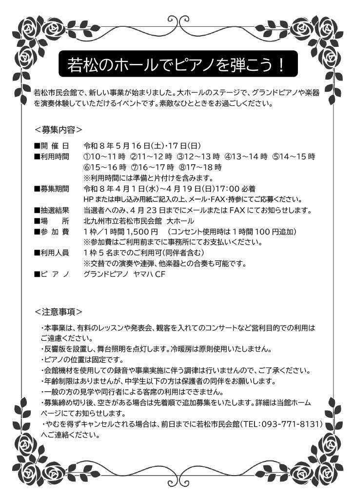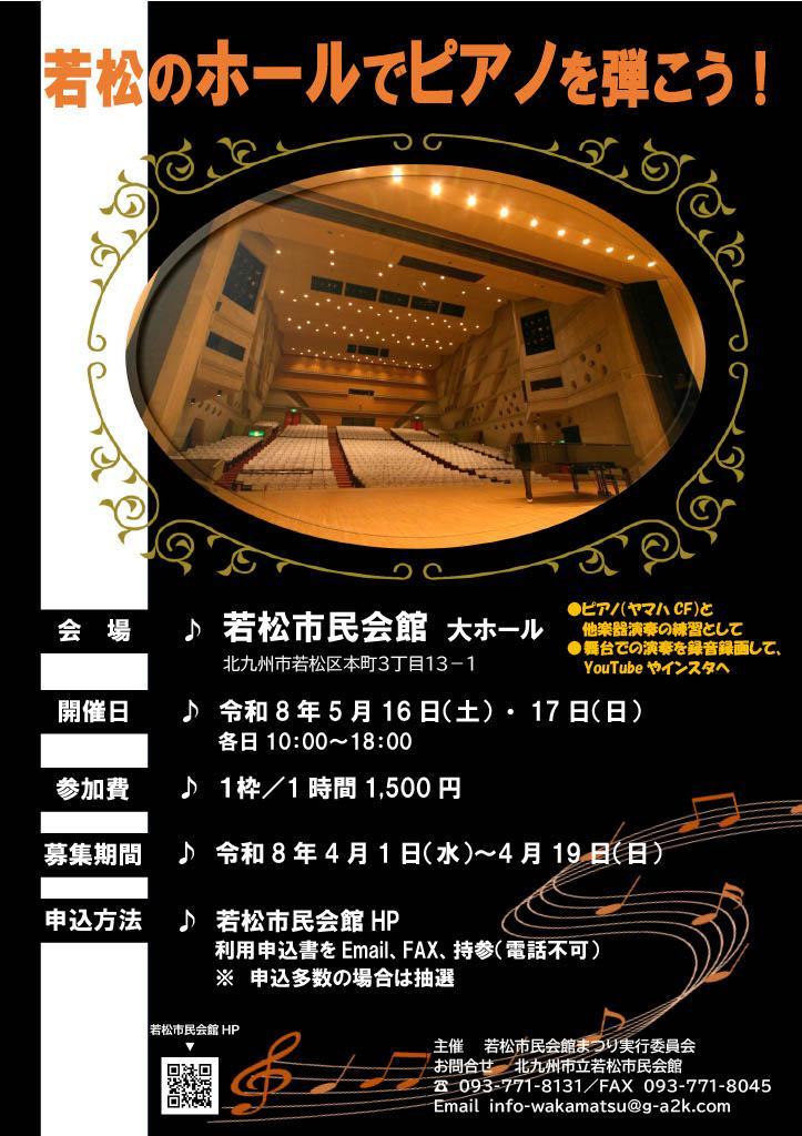 若松市民会館の大ホールのステージで、グランドピアノや楽器を演奏体験していただけるイベントです。