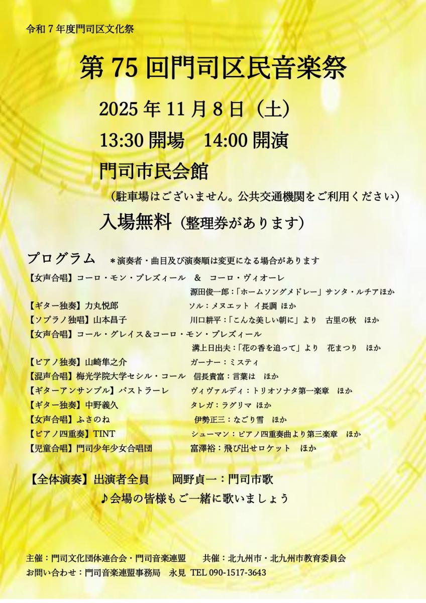 門司在住の音楽家による合唱や声楽、ピアノ、ギター、ピアノ四重奏で、クラシックや日本の歌などを演奏します